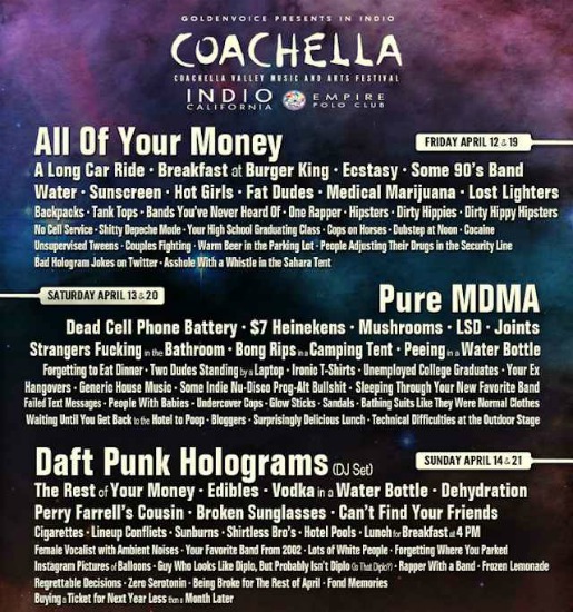 Here it is–a “leak” of the 2013 Coachella line-up, according to Funny or Die. (Personally, I think 138 miles is bit of a haul for Regrettable Decisions.)